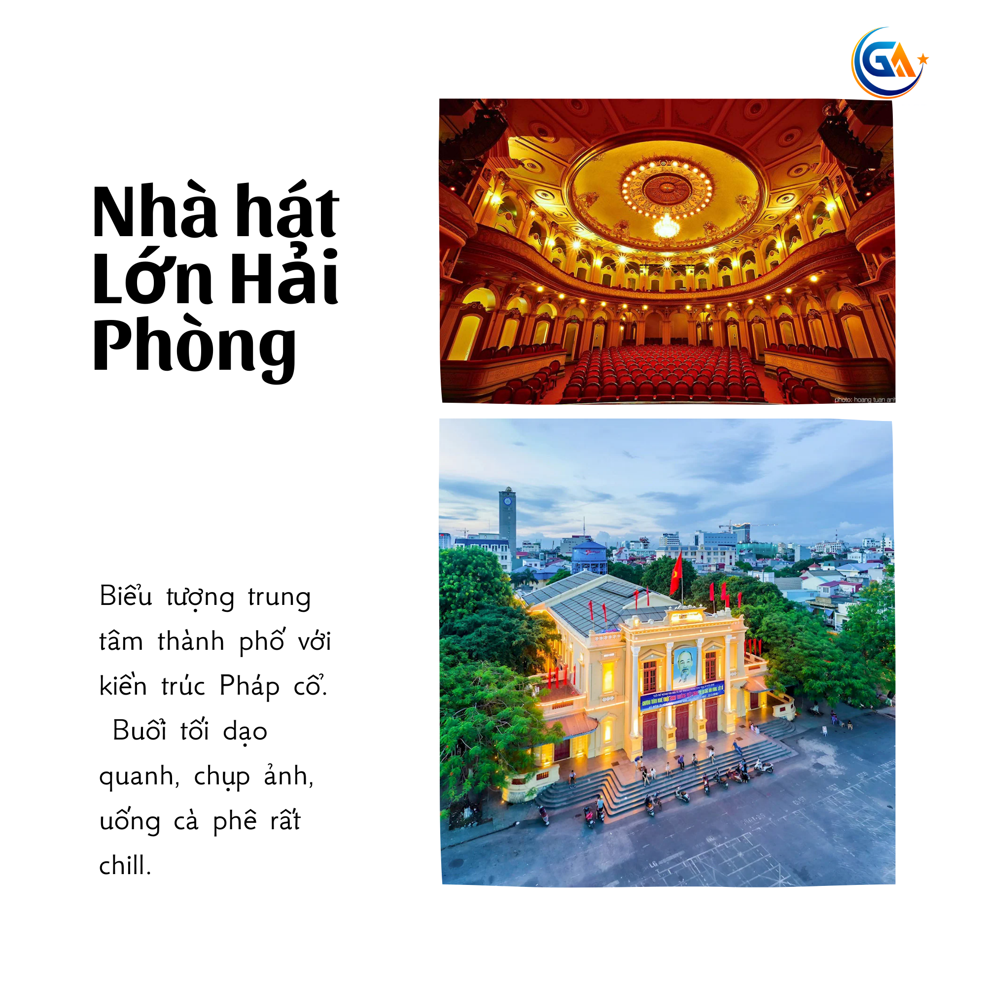 Nhà hát Lớn Hải Phòng gây ấn tượng với kiến trúc Pháp cổ sang trọng, nằm ngay trung tâm thành phố. Đây là điểm check-in quen thuộc của du khách khi đến Hải Phòng. Buổi tối, khu vực quanh nhà hát rất nhộn nhịp, thích hợp dạo chơi, chụp ảnh và uống cà phê.