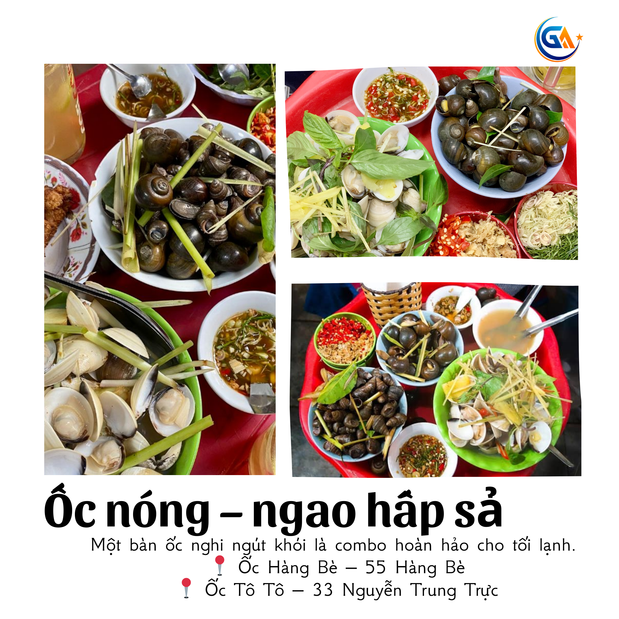 Ốc nóng, ngao hấp sả là món chuẩn mùa đông Hà Nội. Hơi nóng bốc lên, vị cay nhẹ, thơm mùi sả gừng, ăn xong là thấy ấm tay – ấm người – ấm mood.