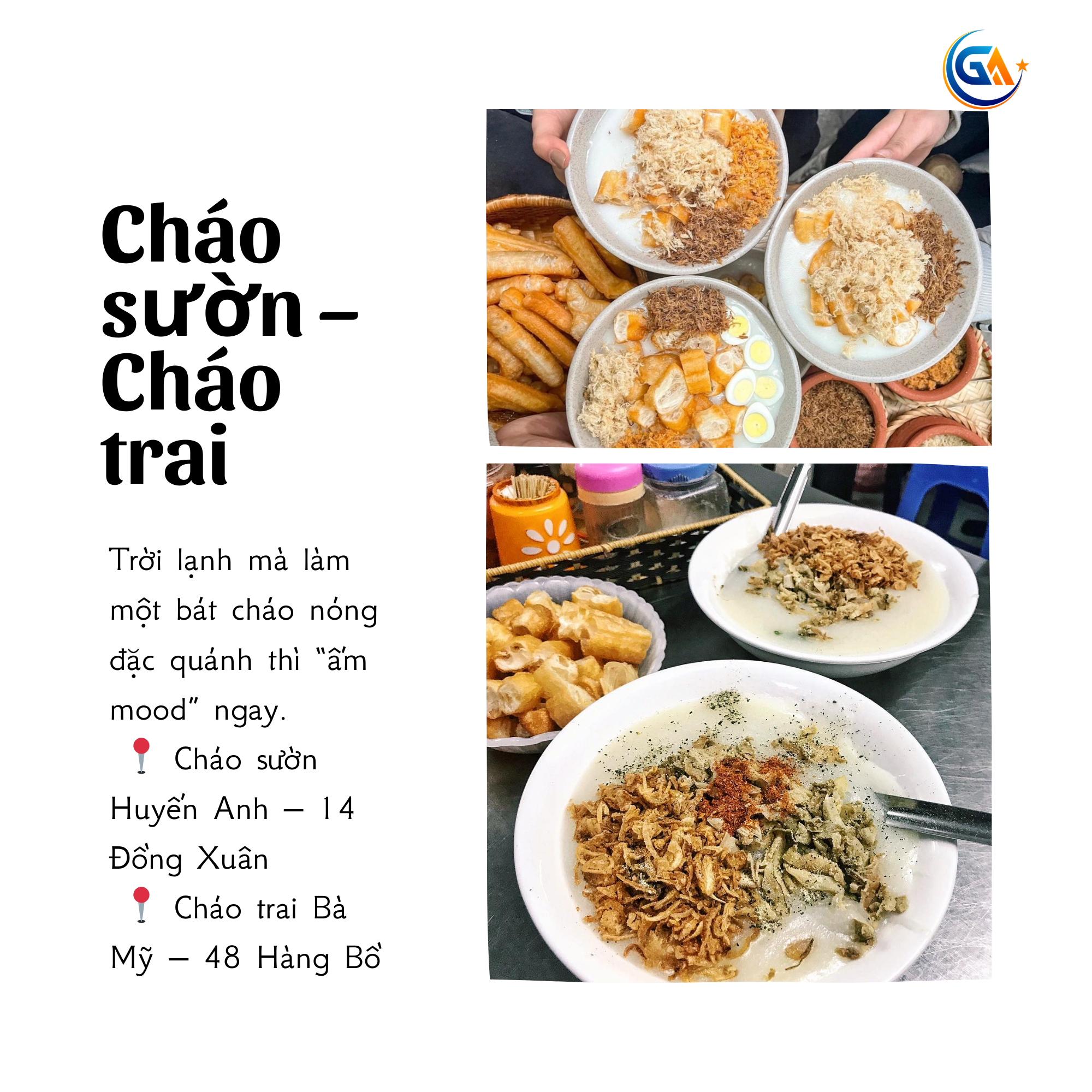 Không có gì hợp hơn một bát cháo nóng hổi khi Hà Nội xuống 14–17°C. Cháo sườn mềm mịn, cháo trai thanh ngọt, dễ ăn và ấm bụng, đặc biệt phù hợp với buổi tối se lạnh.