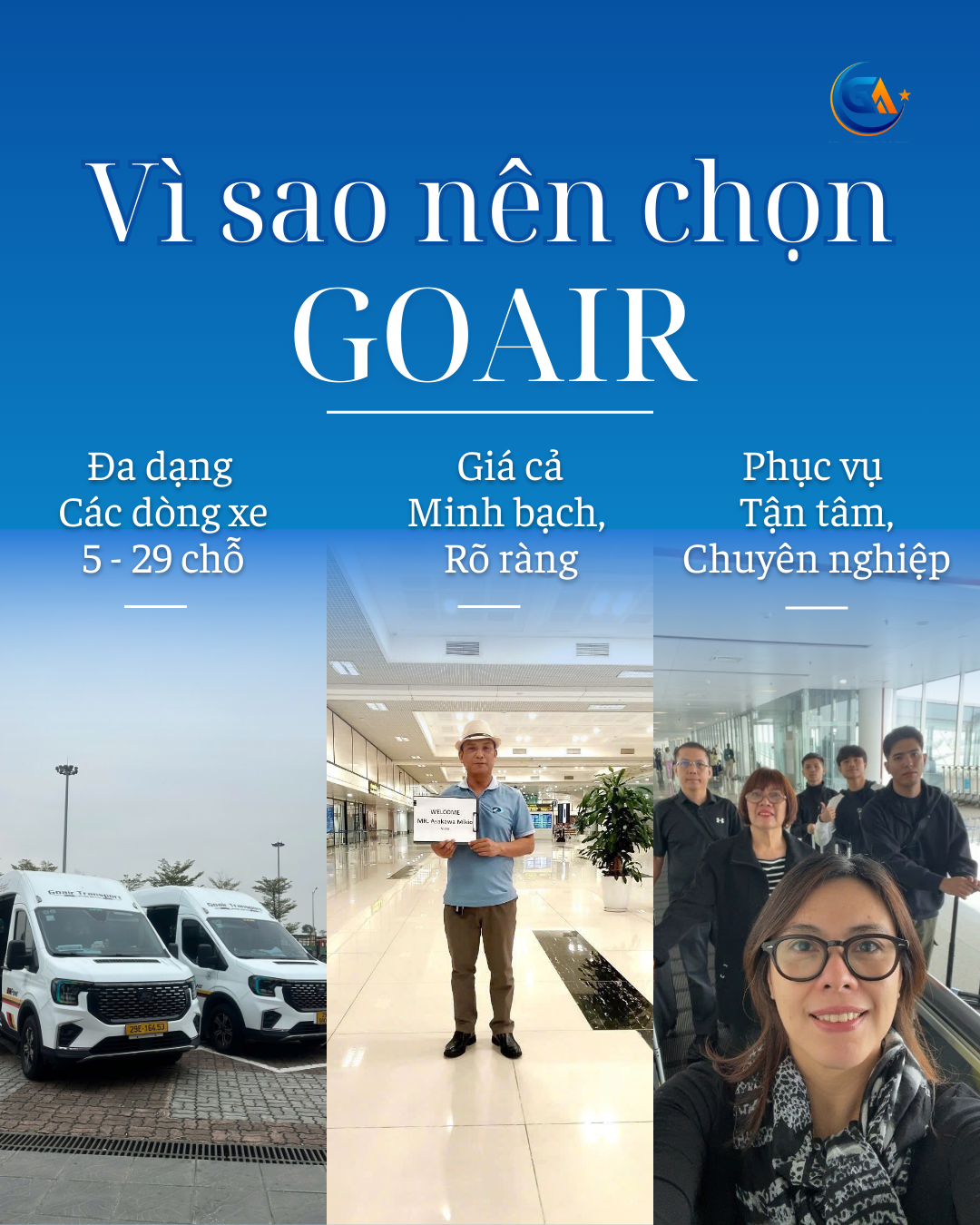 Trong bối cảnh nhu cầu di chuyển du lịch, công tác và đưa đón sân bay ngày càng cao, việc lựa chọn một đơn vị vận chuyển uy tín, đúng giờ và chuyên nghiệp là điều rất quan trọng. GoAir tự hào là đơn vị cung cấp dịch vụ xe du lịch được nhiều khách hàng tin tưởng nhờ những giá trị cốt lõi sau:
